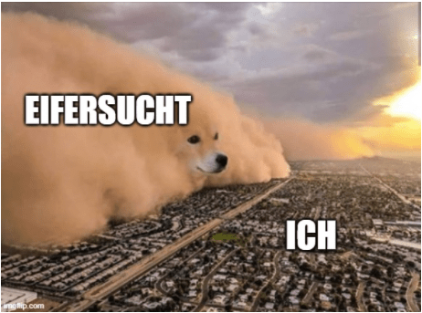 Ich habe ein Problem mit meiner Eifersucht, und zwar ganz direkt und persönlich: Ich mag sie nicht. Sie fühlt sich nicht gut an, sie taucht in unpassenden Momenten auf, macht mich unleidlich und unfair, misstrauisch und ungeduldig. Nichts davon bin oder fühle ich gern. Aber sie kommt wie in diesem Meme und stülpt sich über mich, bis ich nichts mehr sehe. Alle Tricks („Was nützt sie dir?“ / „Versuch, verständnisvoll mit dir zu sein.“ / „Führe einen Realitätscheck durch.“) fruchten nicht wirklich und es bleibt nur abzuwarten, bis sie abgeklungen ist.